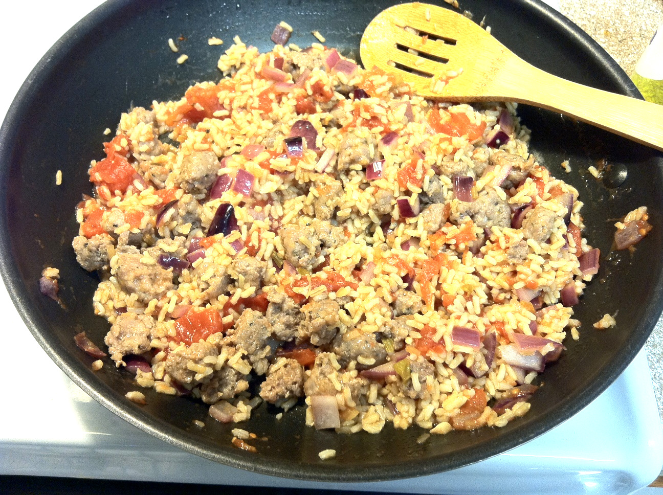 Preheat oven to 350.  Cook brown rice to package instructions using chicken broth rather than plain plain water (if you wish), it does add a lot more flavor.  In a large pan, add the sausage chunks and cover with 1/4 cup of water.