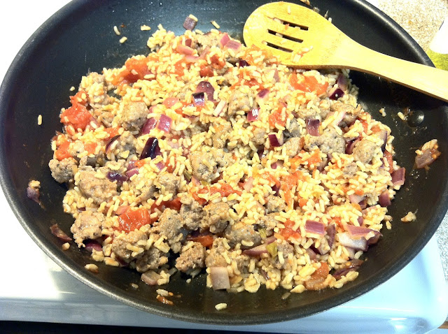 Tonight I made sausage and brown rice stuffed peppers.  They are super easy to make and are extremely filling.  I usually eat two peppers which is right around 300 calories and they are pretty lowfat.  I like to cook the sausage in water and drain out all the liquid because that helps cook out a lot of the excess grease and keep the fat count down.  Recipe adapted from laurenconrad.com.
