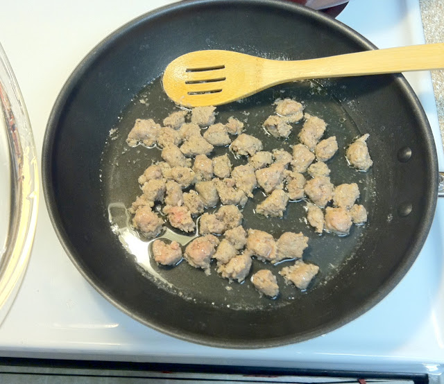 Put on medium heat until water is hot and is almost to a boil (you can add more water if you need to) then cover and reduce heat to med/low.  Cook covered for about 10 minutes stirring occasionally and breaking sausage down into smaller bits with spoon.