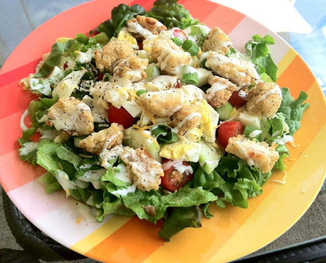 Texas Roadhouse has one of the best salad ever, the Chicken Critter salad and if you haven't had it I would highly recommend it. It's a giant plate of green leaf lettuce topped with chicken fingers, cheese, tomato, onion, egg, and most importantly your dressing of choice. But why wait to eat this plate of leafy green goodness until your next trip out, make your own at home.